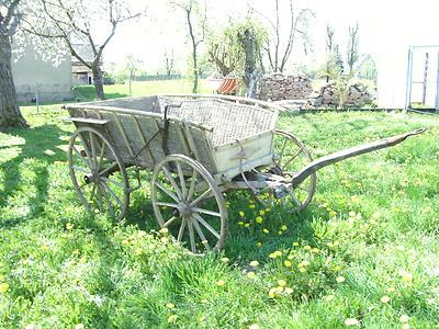 Es handelt sich um einen alten Heuwagen mit den Abmaßen (ca.) Länge ca 200 cm (bzw. ohne abgebaute Deichsel 330 cm), Höhe 130 cm, Breite 150 cm, Gewicht ca. 150 KG.