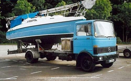 embarcación en una nave.a tener en cuenta que tiene que ser plataforma con grua para poder cargar el barco..barco pesado y a una distancia del camión de unos 3-4 metros.Creo que es posible transportarla en remolque.