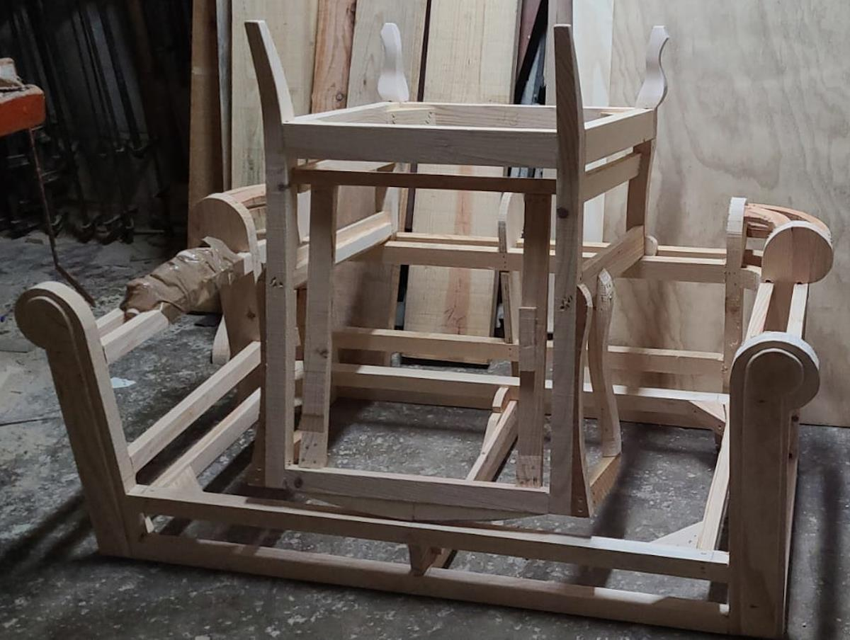 Es una estructura de madera, es el interior de un sofá y butaca montados uno encima de otro para que ocupen menos espacio.