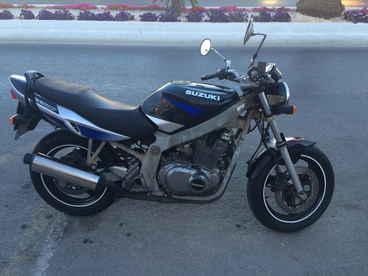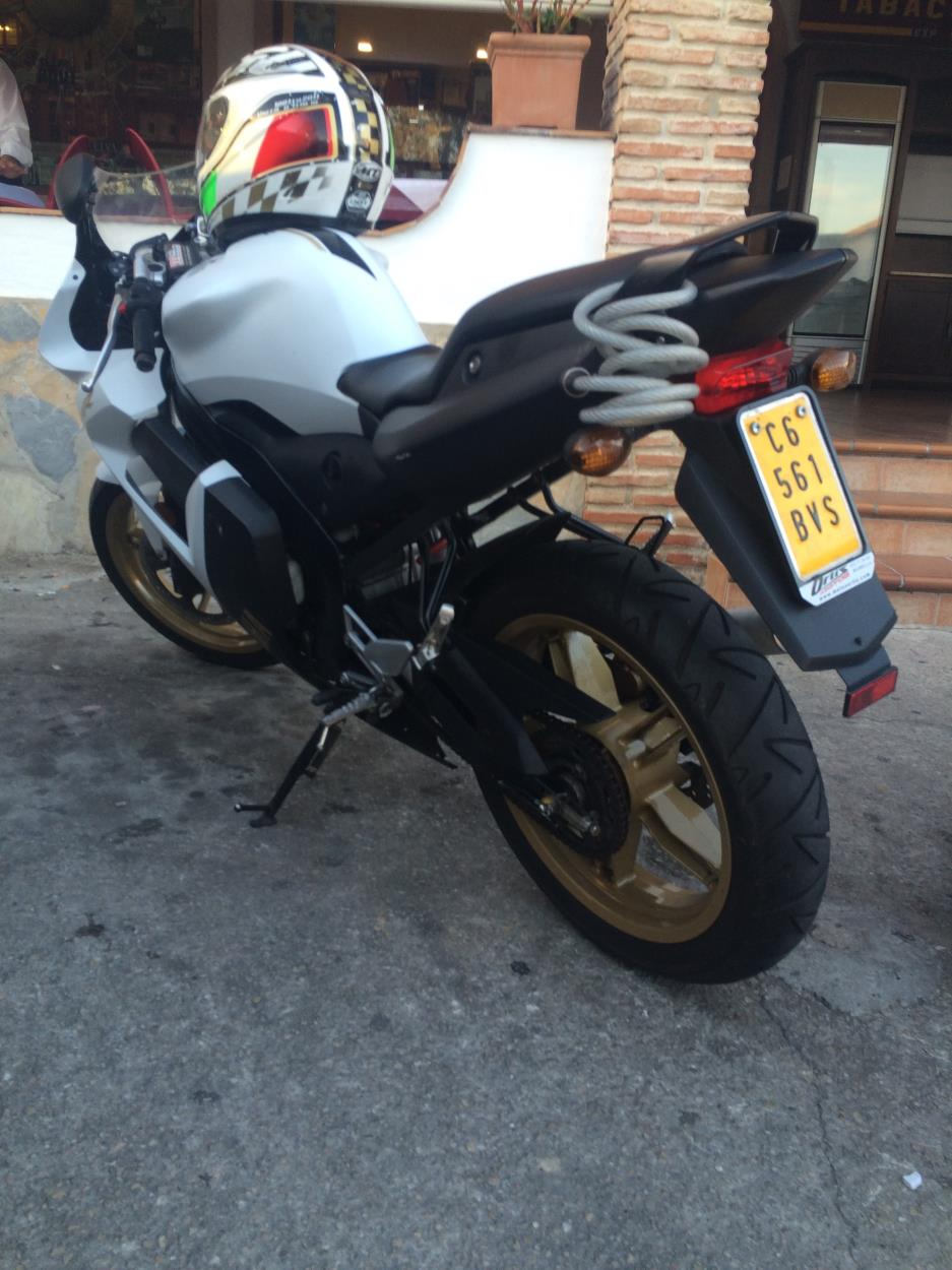 La moto funciona perfectamente, no dispone de caballete central, apoya en pata de cabra. Posiblemente portará alguna maleta con equipaje, cuyas dimensiones no excederán las reglamentarias, tampoco sumarán mas de 50 kilos en equipaje.