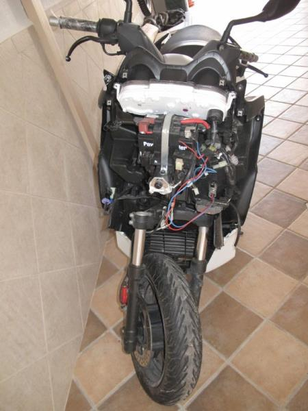 Moto con pequeño golpe delantero que no afecta a su movilidad.