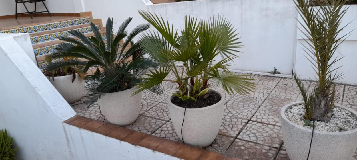 Son cuatro maceteros de piedra con las plantas incluidas que pesan unos 65Kg cada uno. Tendrían que ser cargados y descargados por el transportista.