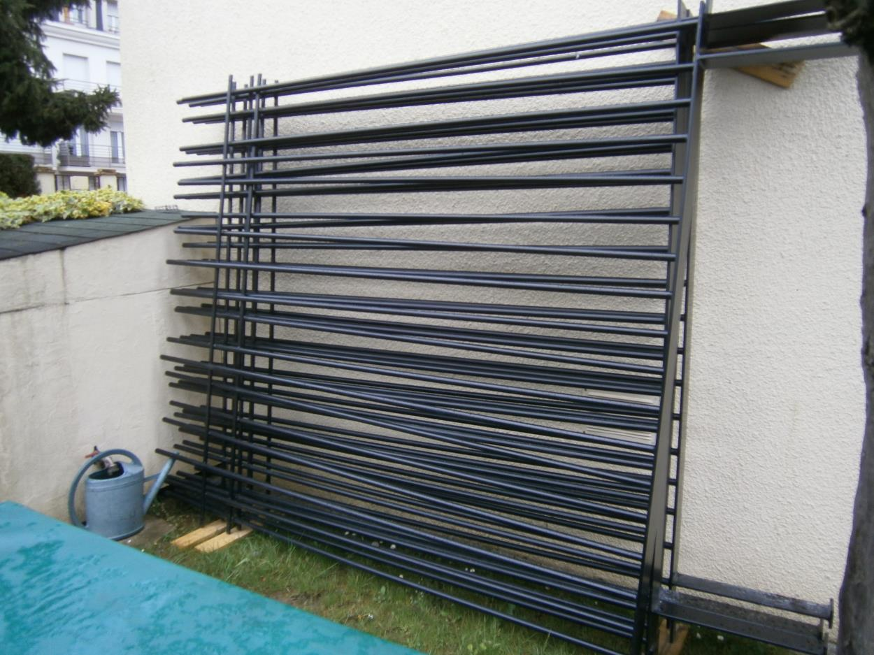 7 éléments de clôtures acier disposés en longueur dans un cadre métallique.