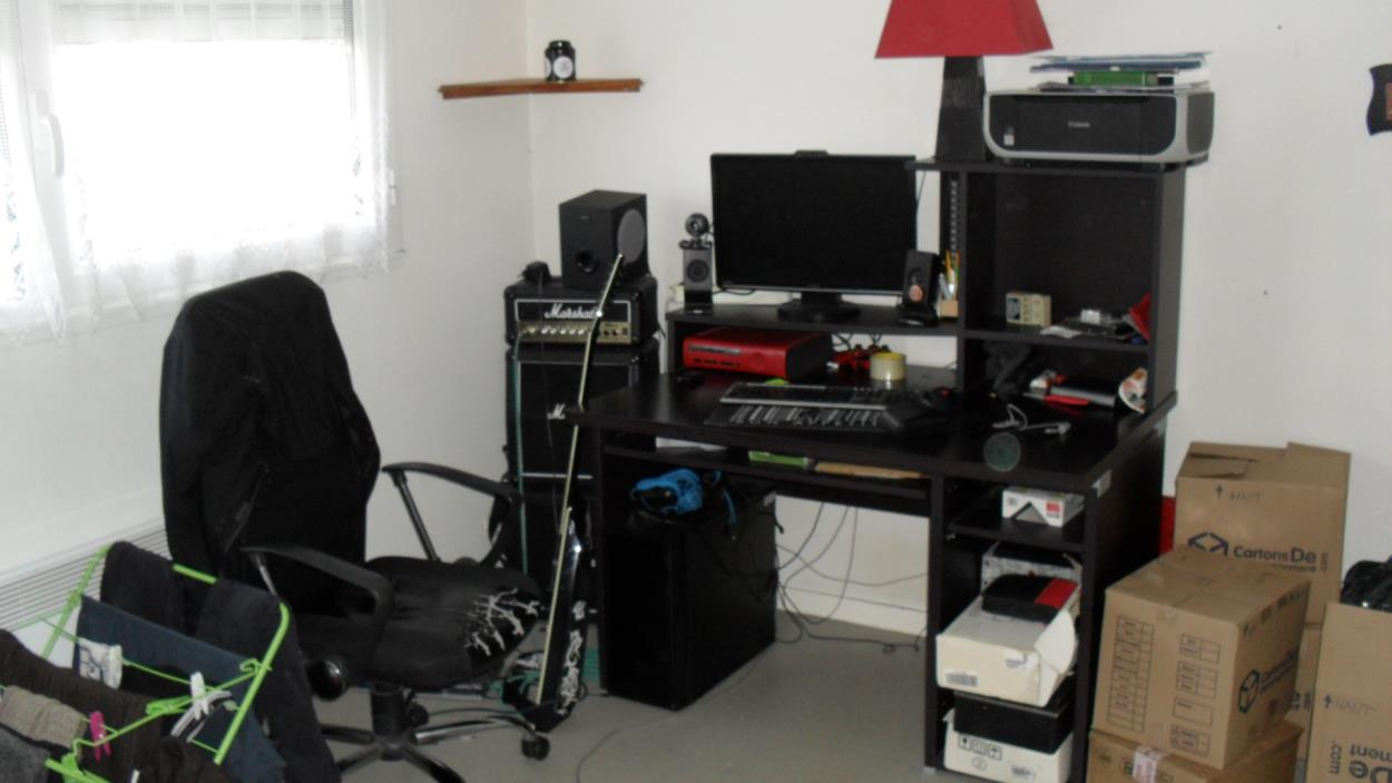 Tout apparait sur les photos sauf le réfrigérateur, 2 tapis (environ 200x140), 1 panier à linge , 1 poubelle, 1 lustre, 1 plante, 1 aspirateur et un balai.