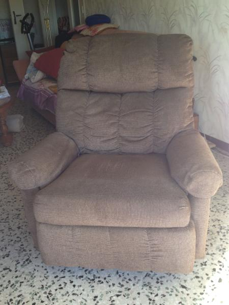 Arrivée : pavillon avec quelques marches jusqu'à porte d'entrée (canapé, fauteuil, lave linge, bois de lits), ou garage ( simple rampe goudronnée : sèche linge, table de séjour et rallonges, table de cuisine).