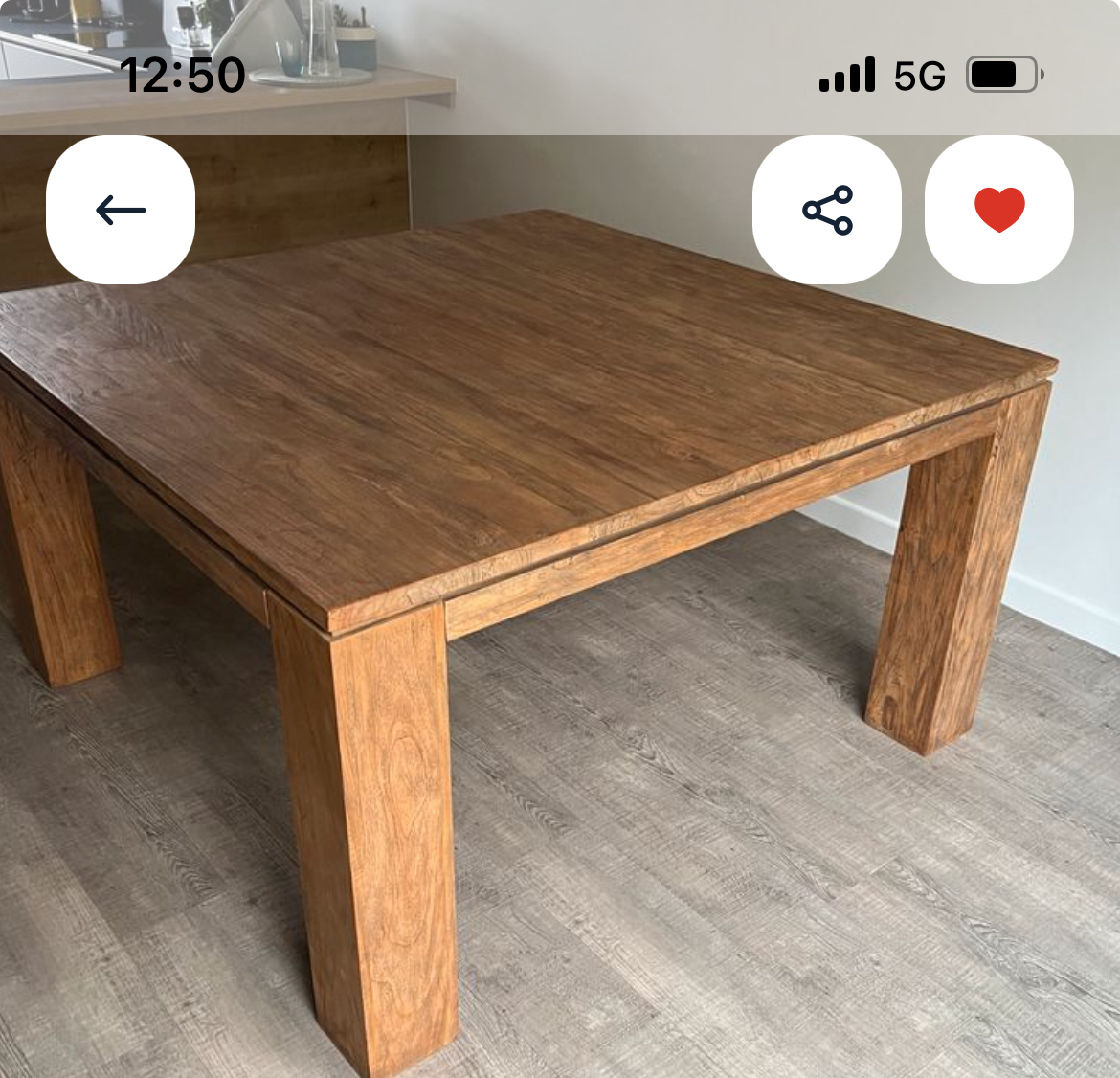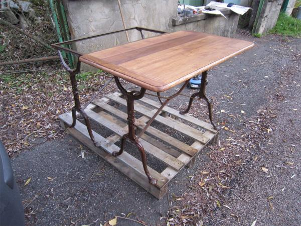 Table en bois massif- En 2 parties : plateau et piètement. Environ 100kg chacun Accès maison par un petit chemin (2 mètres 30). Portail Largeur 4 mètres. La table se trouve au rez-de-chaussée de chaussée de la maison. On peut accéder à la voiture par le jardin. 1 personne sur place pourra aider.