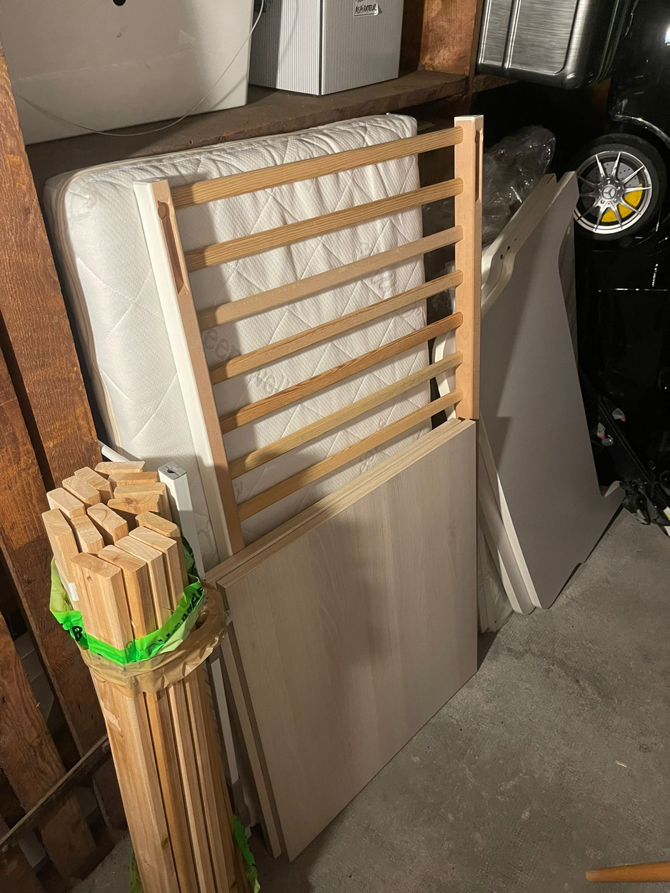 Delivery on the 3rd floor (no elevator). Pick up in a house. 1 sofa (3 seats) 1 coffee table 3 rather small shelves 4 foldable chairs 1 fridge 1 office chair 1 bed (single bed that can open into a double bed)
