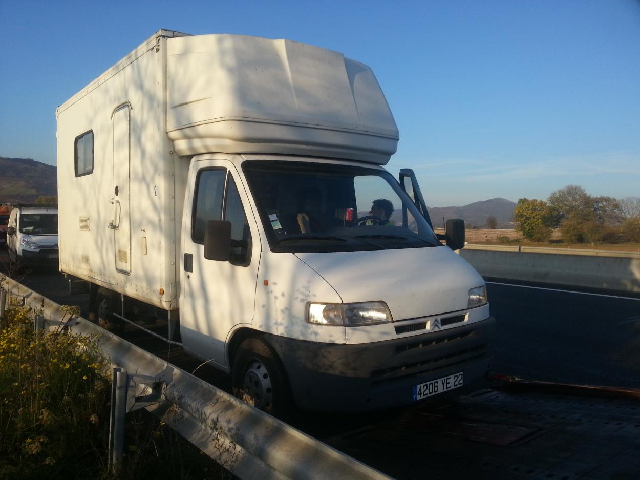 La roulotte est sur des essieux et roues, il faudrait la monter avec un treuil ou autre pour le chargement.