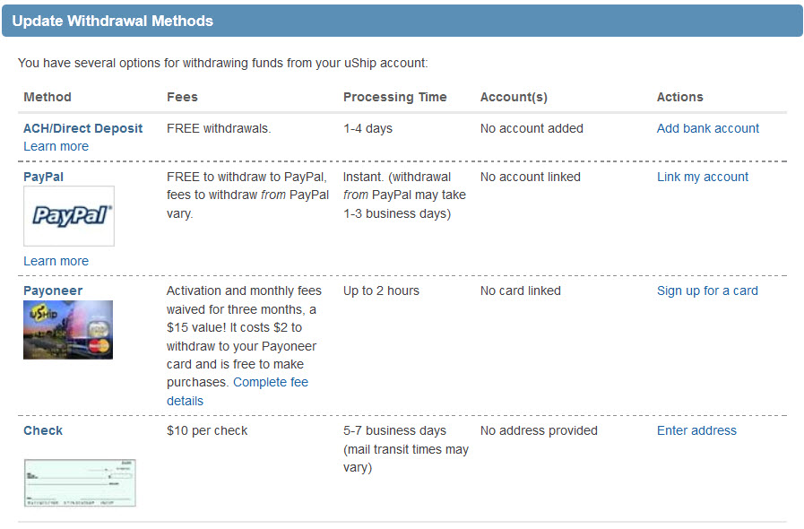 If you're a Broker or Transporter who is opted into uShip Payments, you have options! You have four methods available to withdraw funds from your uShip account.