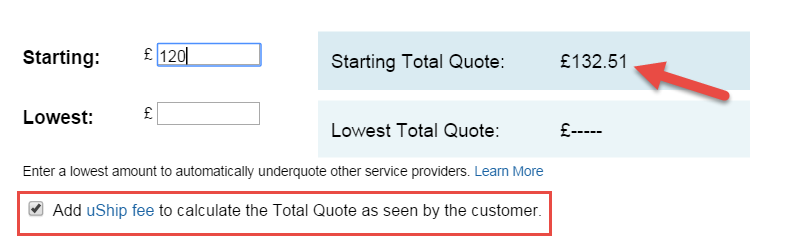 We've also included a nifty Quote Calculator you can use when placing your bids. All you need to do is input the amount you want to make in the Starting section, and make sure the Add uShip fee to calculate the Total Quote as seen by the customer check-box is selected. If you're curious about your fees on a particular transaction, just subtract the Starting amount from the Starting Total Bid amount, and you have your fee.