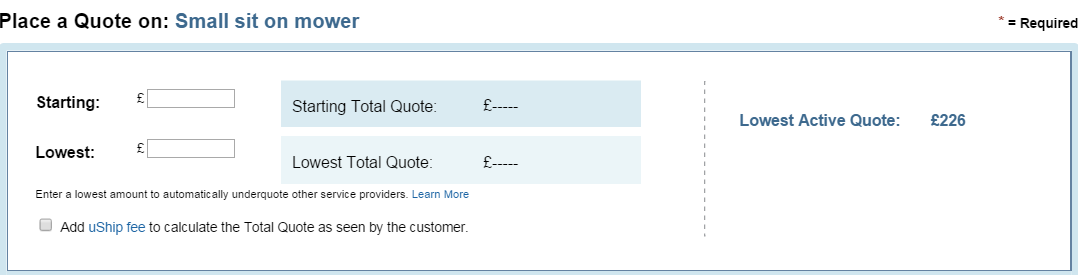 - Enter the amount you would like to earn – Enter this amount in the “Starting” field on the bid form. Your fees will automatically be calculated so you will then see your Starting Total Quote, which is the amount the customer will see. This is the price you should reference in all communication.