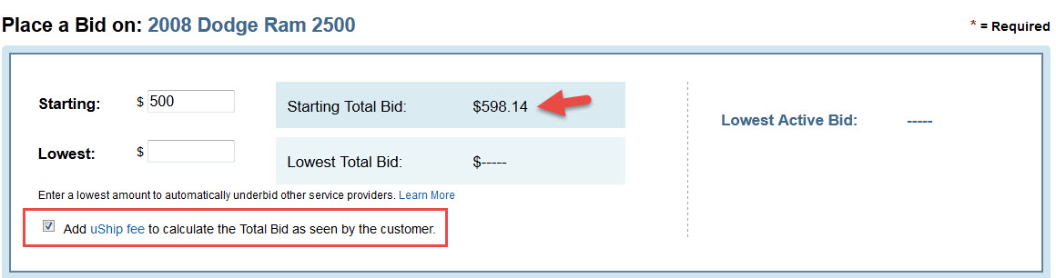 We've also included a handy dandy Quote Calculator you can use when placing your quotes. All you need to do is input the amount you want to make in the Starting quote section, and make sure the Add uShip fee to calculate the Total Quote as seen by the customer check-box is selected. If you're curious about your fees on a particular transaction, just subtract the Starting amount from the Starting Total Quote amount, and you have your fee.