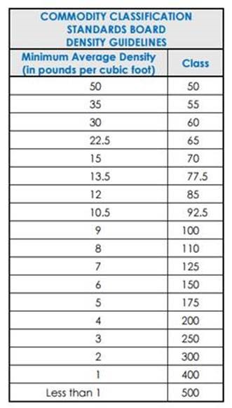 Once the PCF is determined for the entire shipment, the corresponding density based freight class can be found on the National Motor Freight Traffic Association's Commodity Classification Standards Board Density Guidelines chart.