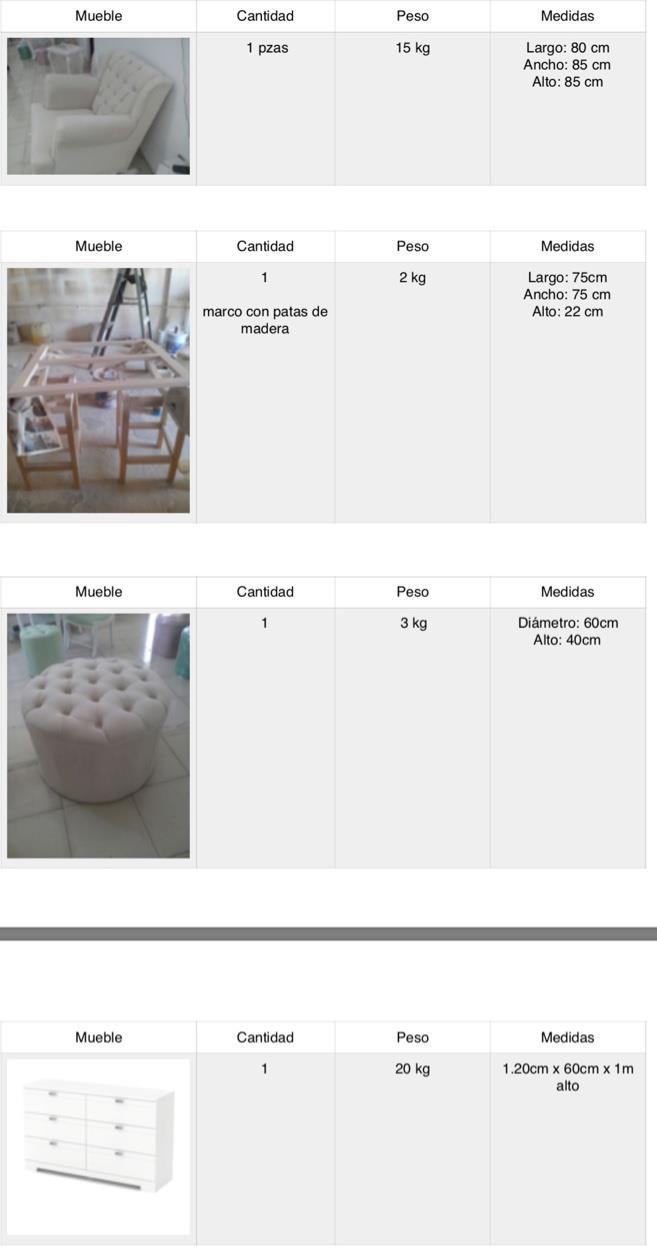 Además de los muebles mencionados, se enviarían aproximadamente unas 5 o 6 cajas, de pesos variados sin pasar de los 10 kg.