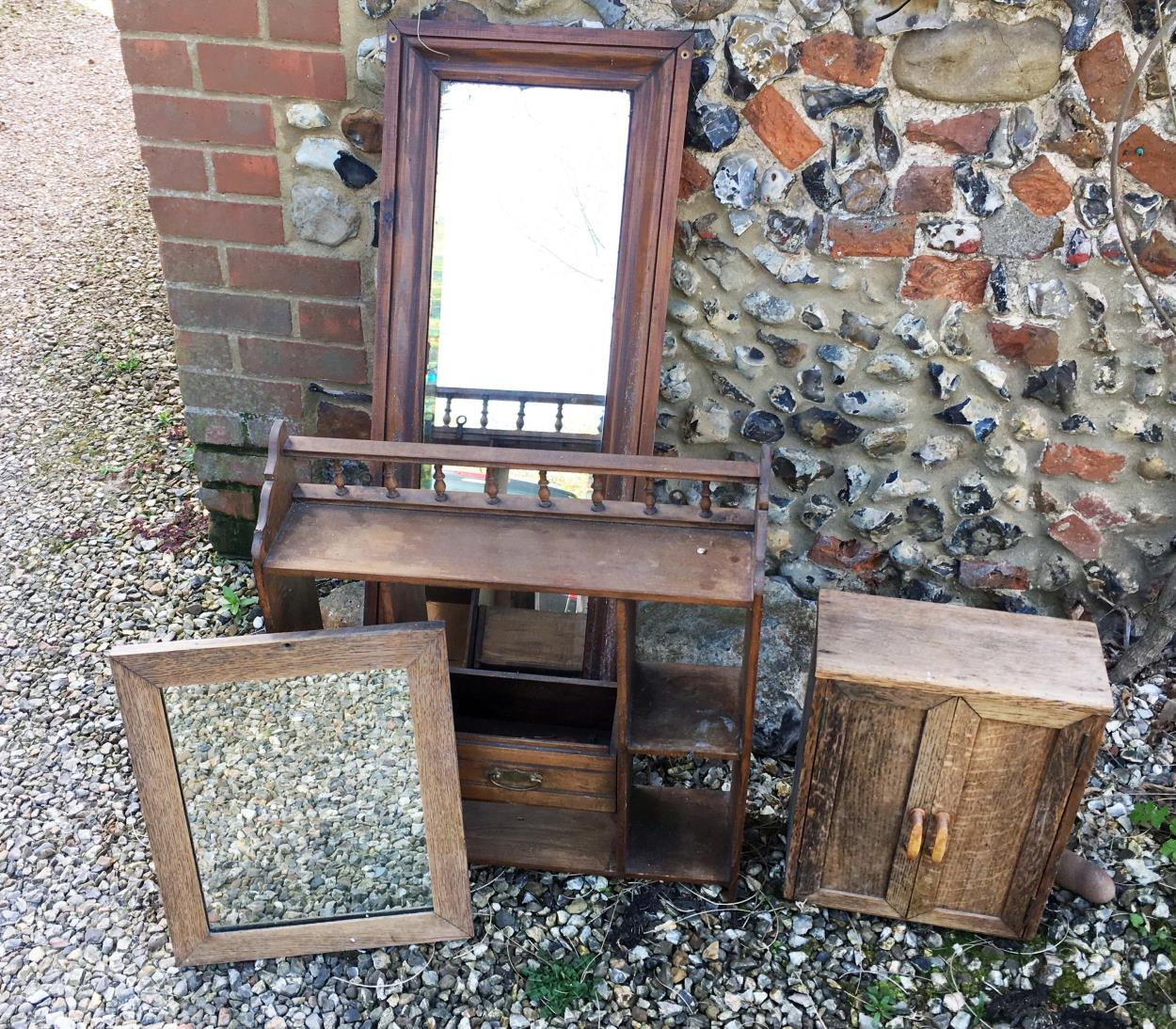 antique furniture: rattan table, Edwardian desk, glass cabinet, stationary stand, georgian dining table, 3 wooden stools, 1 wooden chair.