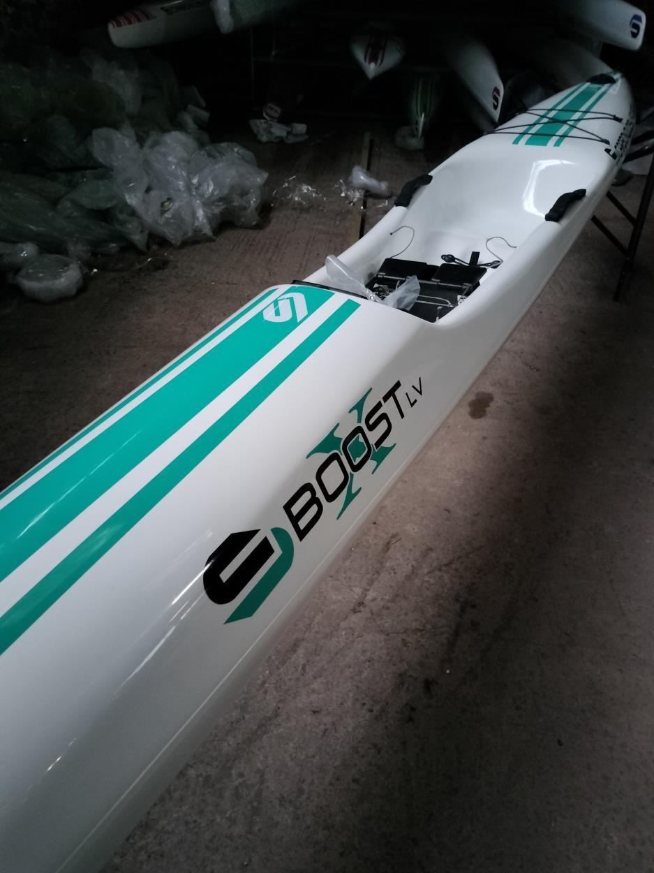 Carbon fibre oars and lightweight V Trolley are stored in the boat under a full cover.