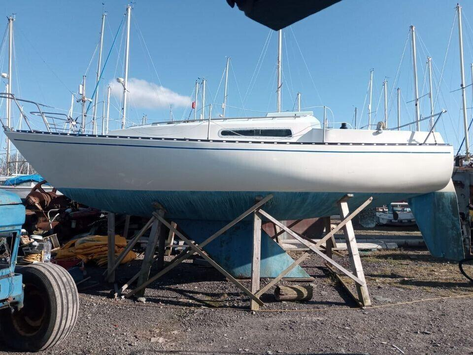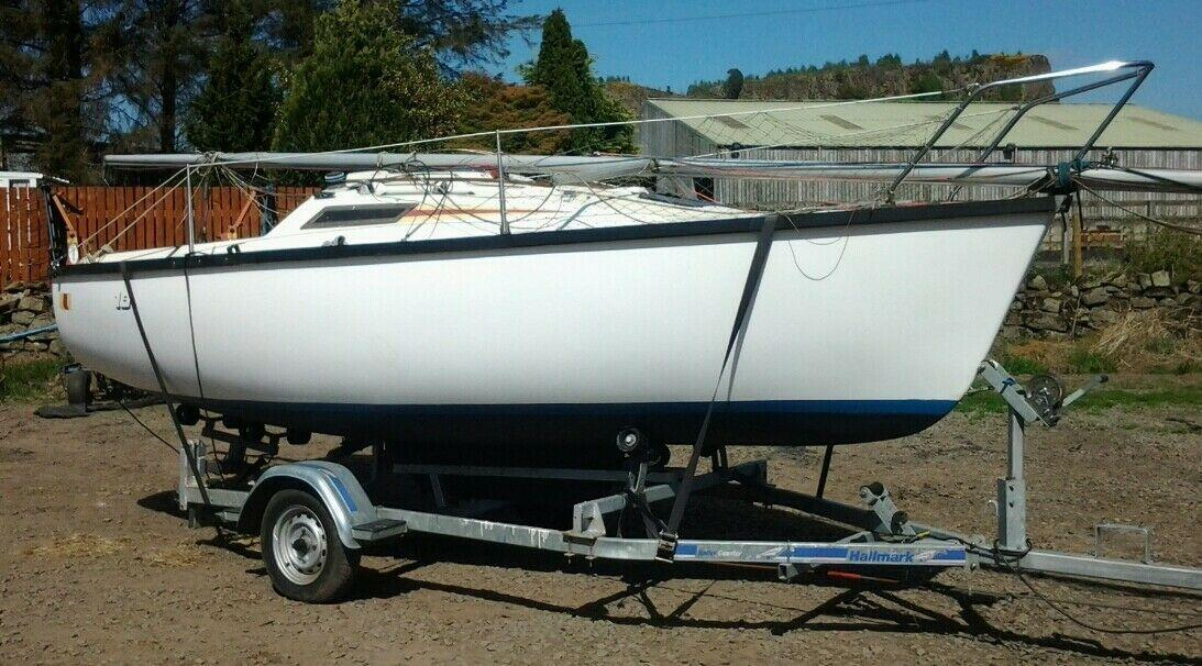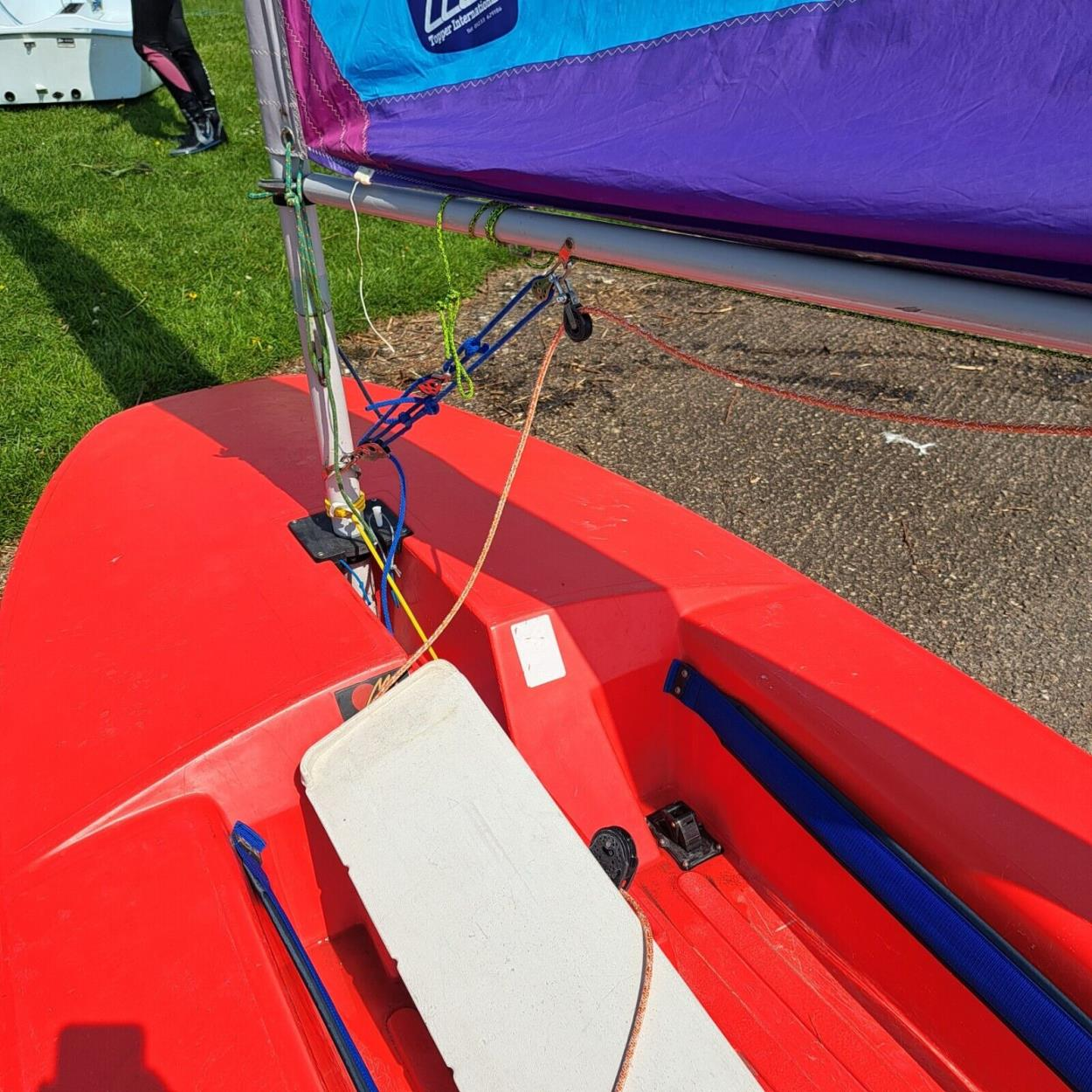 Dinghy is sitting on a road trailer and launching trolley. There is also a mast