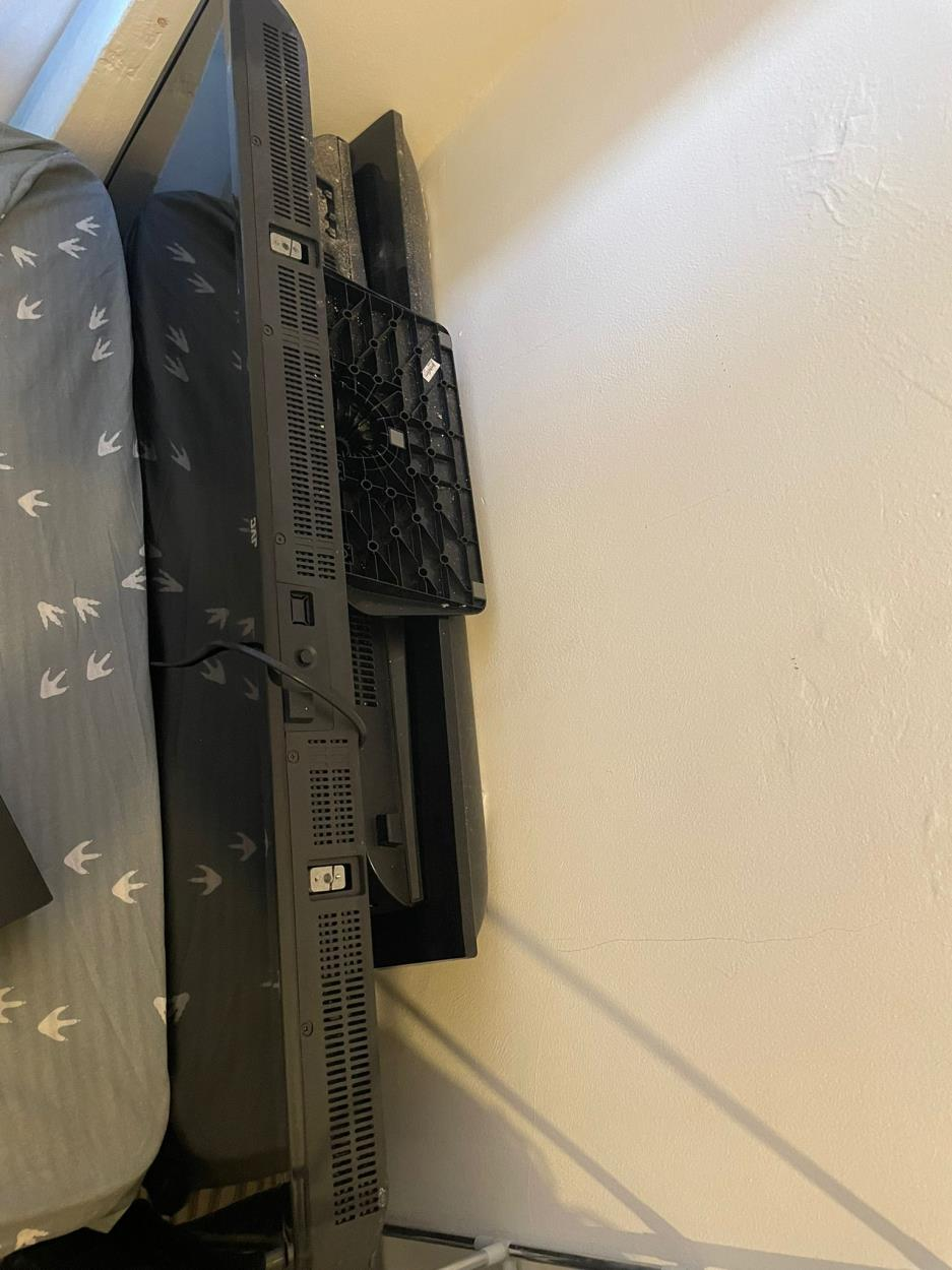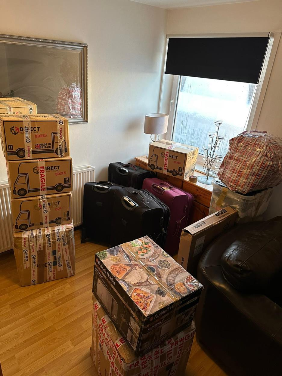 3 bags of kitchen utensils, 2 bags of bedding, side table, boxed tv, suitcase
