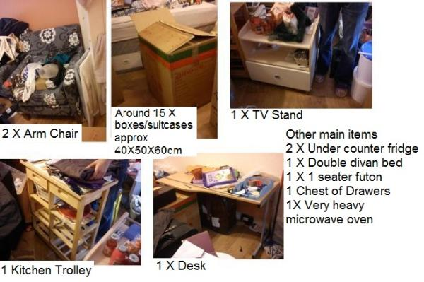 ONLY A SMALL HOUSE MOVE, MAILY BOXES OF CLOTHING, SHOES, MAKE UP, ACCESSORIES. 4 PEICES OF FURNITURE, SMALL COFFEE TABLE, SMALL DVD BOOK CASE, SMALL COMPUTER TABLE AND SMALL 6 SINGLE CHEST OF DRAWER. NOTHING EXTREMELY HEAVY! BUT FAIRLY LONG DISTANCE TO TRAVEL, ABOUT 120 MILES