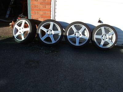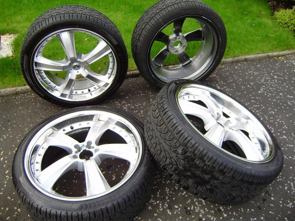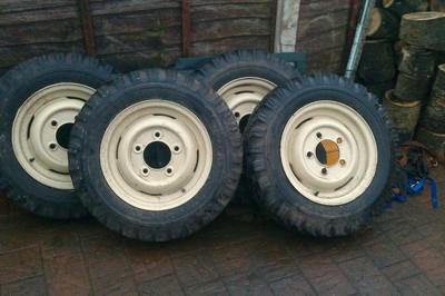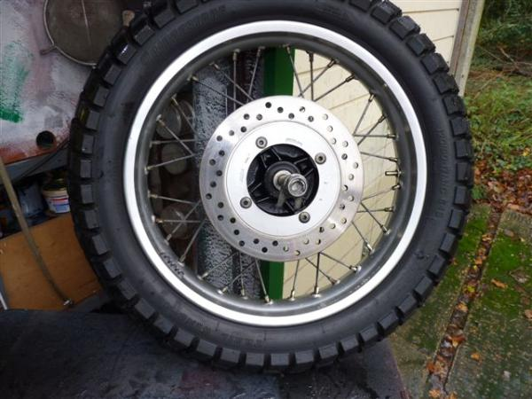 Two motorcycle wheels, tyres and spindles discs